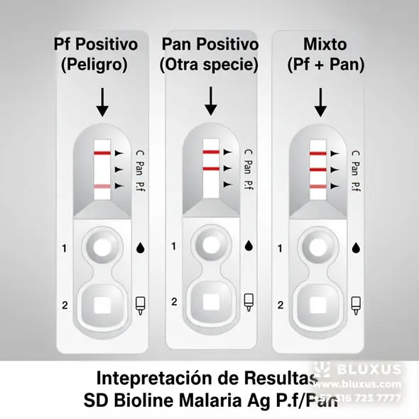 Si solo marca positivo en «Pan» (y negativo en Pf), indica una infección por P. vivax, P. ovale o P. malariae. En Colombia, la gran mayoría de estos casos serán P. vivax. Para confirmar la especie exacta, se requeriría una gota gruesa o la prueba Pf/Pv.