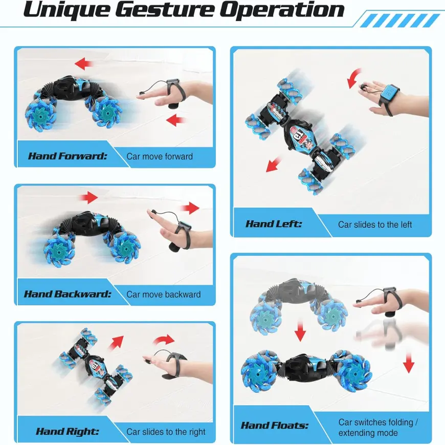 2 modos de control remoto del Carro a Control Remoto 4×4: A diferencia de otros autos de control remoto, el auto de acrobacias a control remoto no solo se puede controlar para moverse por el control remoto tradicional, sino también con un reloj. Cambia tu gesto, el auto RC puede detectar el cambio de tu gesto para conducir y transformarse como quieras.