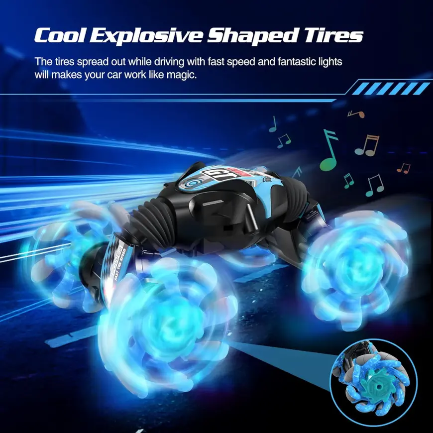 Luces coloridas y música: el cuerpo del automóvil a control remoto tiene luces LED brillantes y coloridas. Cuando los niños juegan con sus amigos, las luces LED pueden iluminar 6 neumáticos transparentes, cuando el auto RC conduce, acompañará la música, lo que traerá más diversión a tus hijos. Les encantará este gadget. Diseño fresco de neumáticos de explosión, los neumáticos se abrirán cuando el auto a control remoto esté funcionando, y las luces lo harán más atractivo